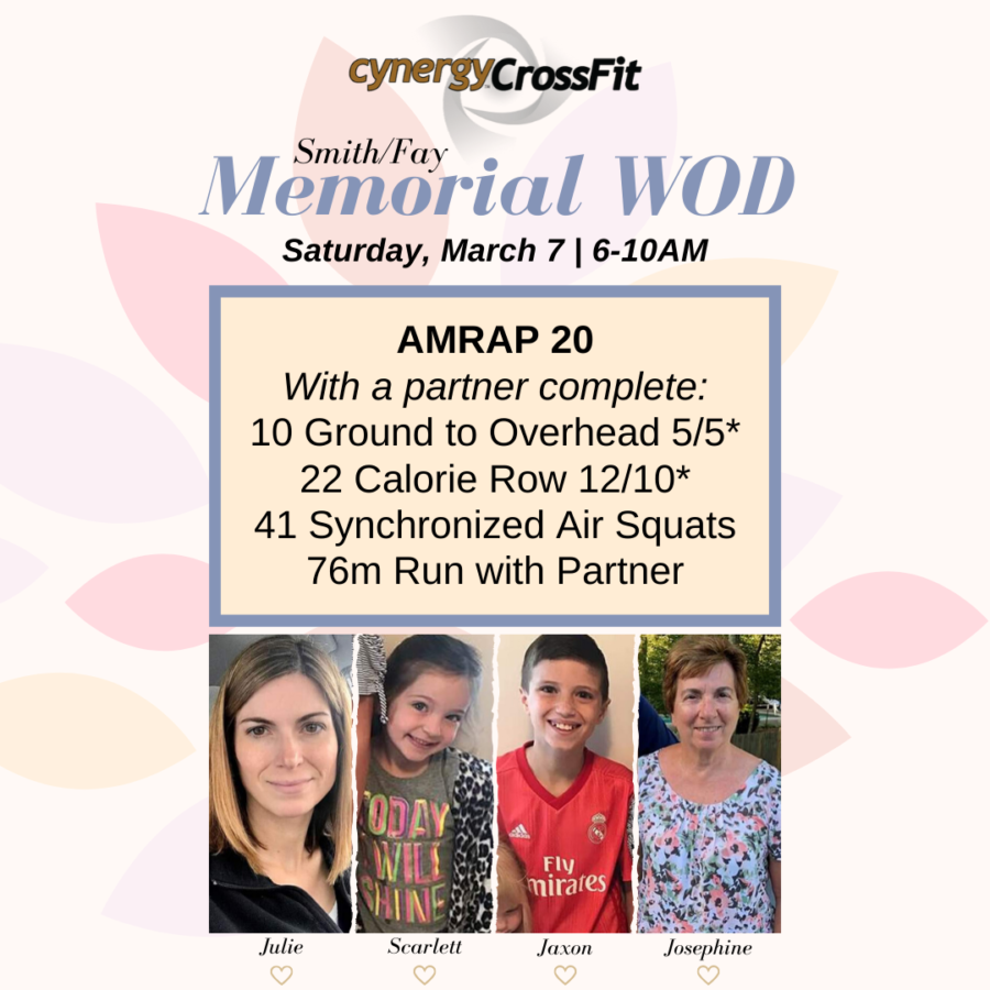 The Smith and Fay families have endured a tragic loss of 4 lives: Scarlett, Jaxon, Julie and Josephine died in a car accident in Florida on February 18 & 19, 2020. They are close relatives of Cynergy CrossFit members Bob, Jenna, Erin and Matt Condon.